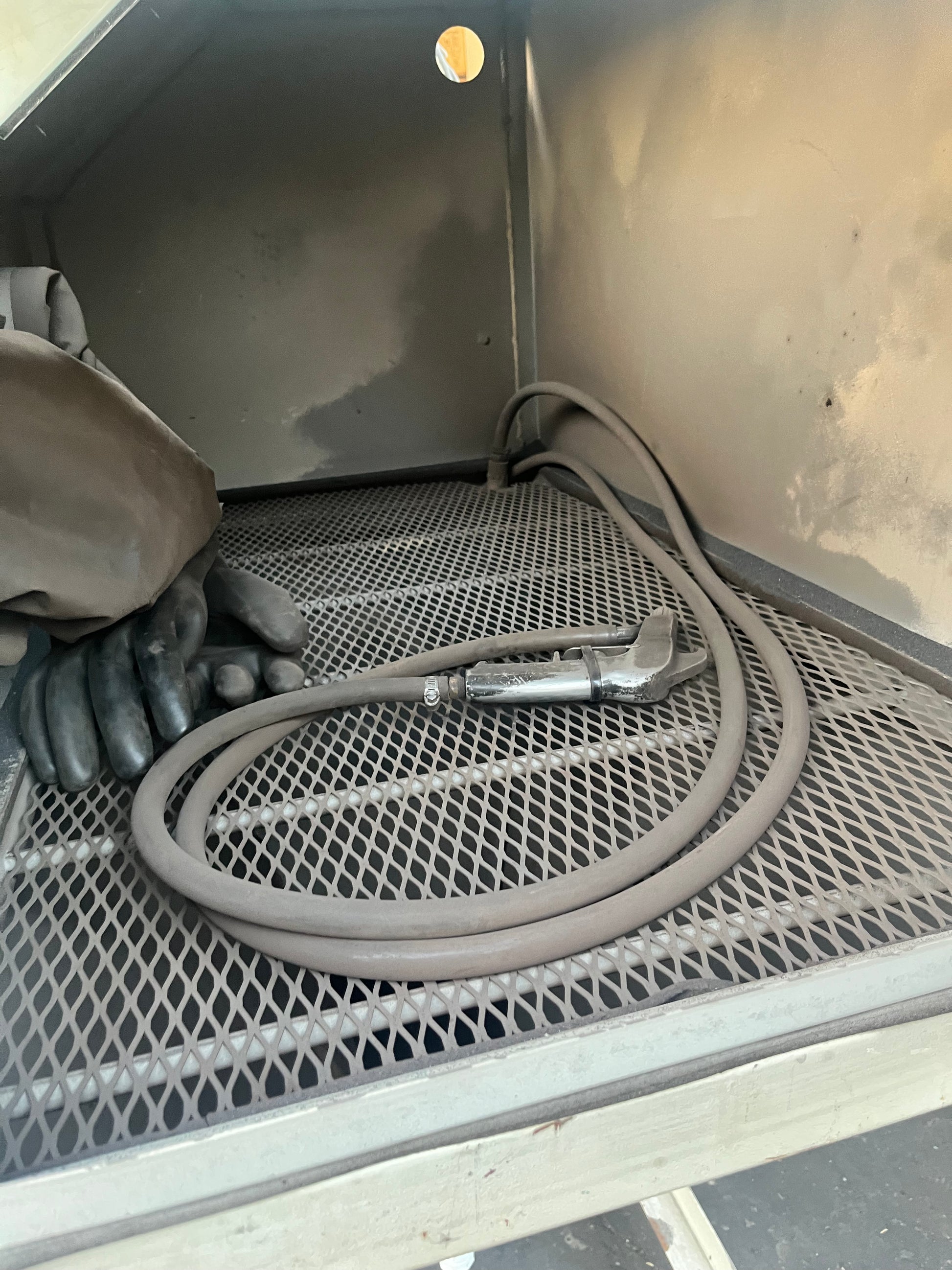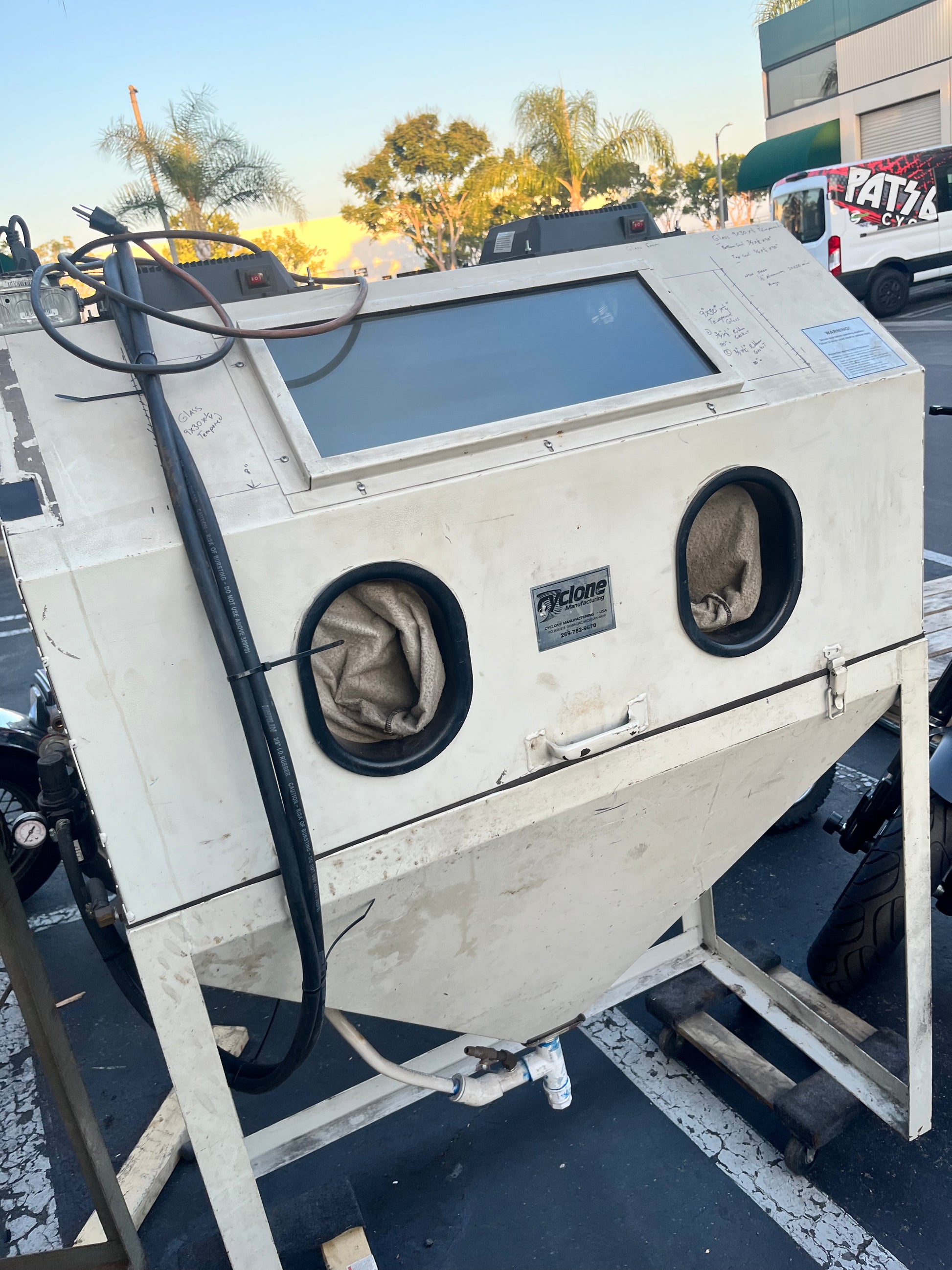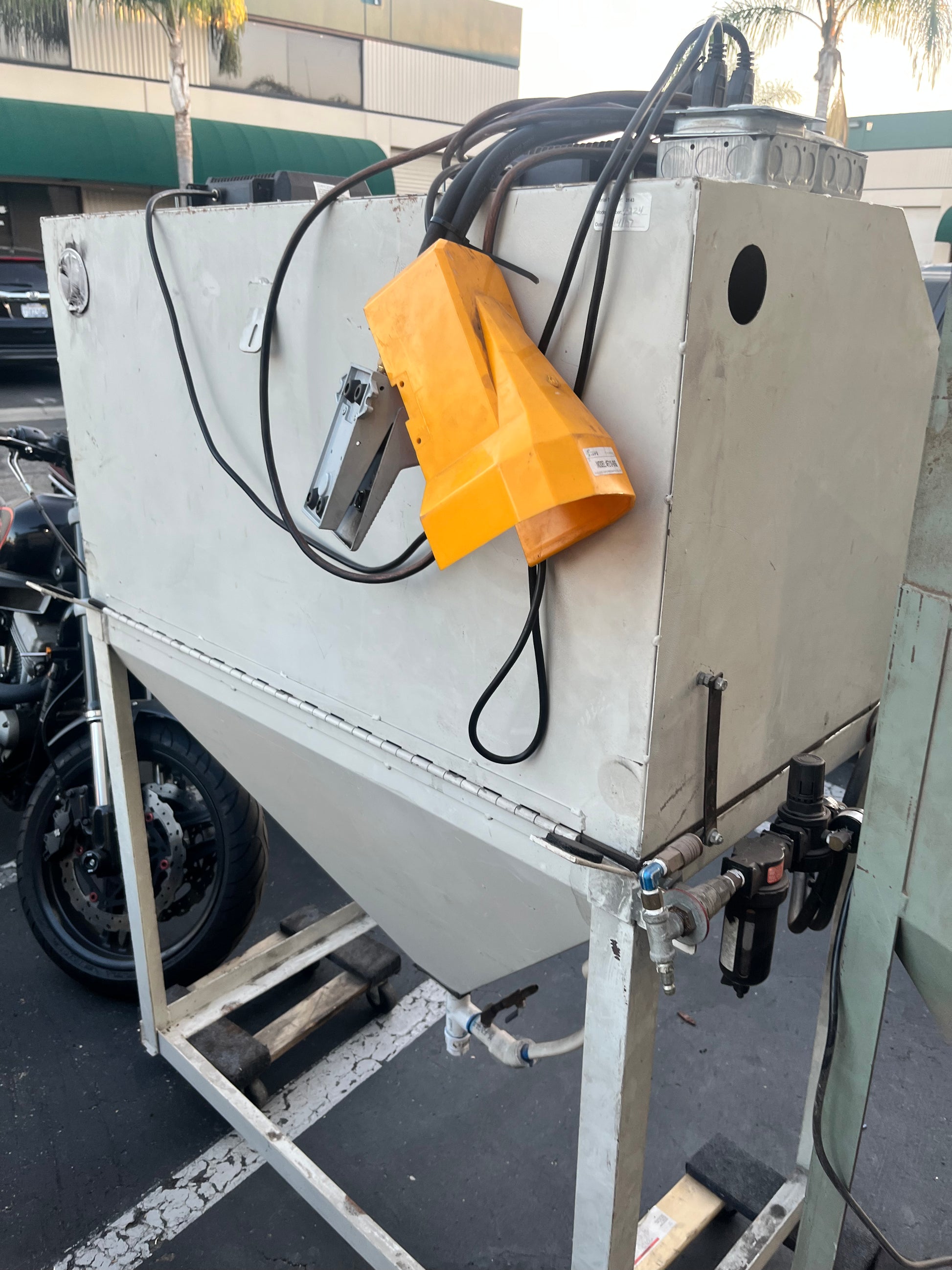 Bought this to replace one of my other units but ended up buying a brand new one. This one is ready to put to work, has aluminum oxide in it, converted to a pressure feed system, new super bright LED lights installed, gloves and glass are in great condition. Side door access and whole top opens for large parts. Includes the exhaust filter system for dust collection.