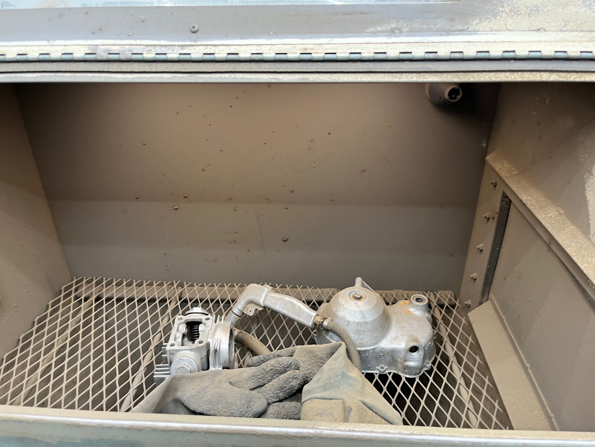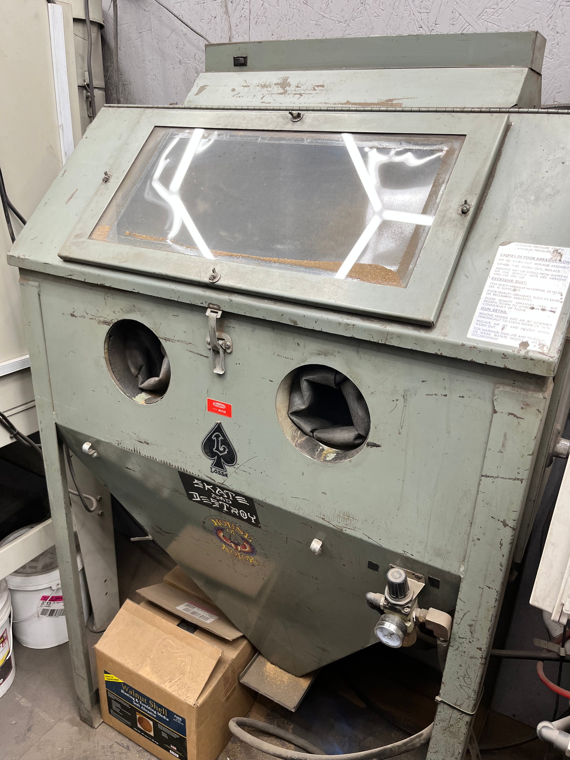 Works perfectly, has a new media shaker motor to keep media going into the siphon tube, LED light inside, the glass window is perfect, we use plastic glass protectors to keep it like new, and also has a boron carbide tip(never wears out), new hoses, top door seal and brand new gloves were just installed, ready to work!! Currently has walnut shell inside. Interior dimensions: 36" wide x 24" deep x 20" tall