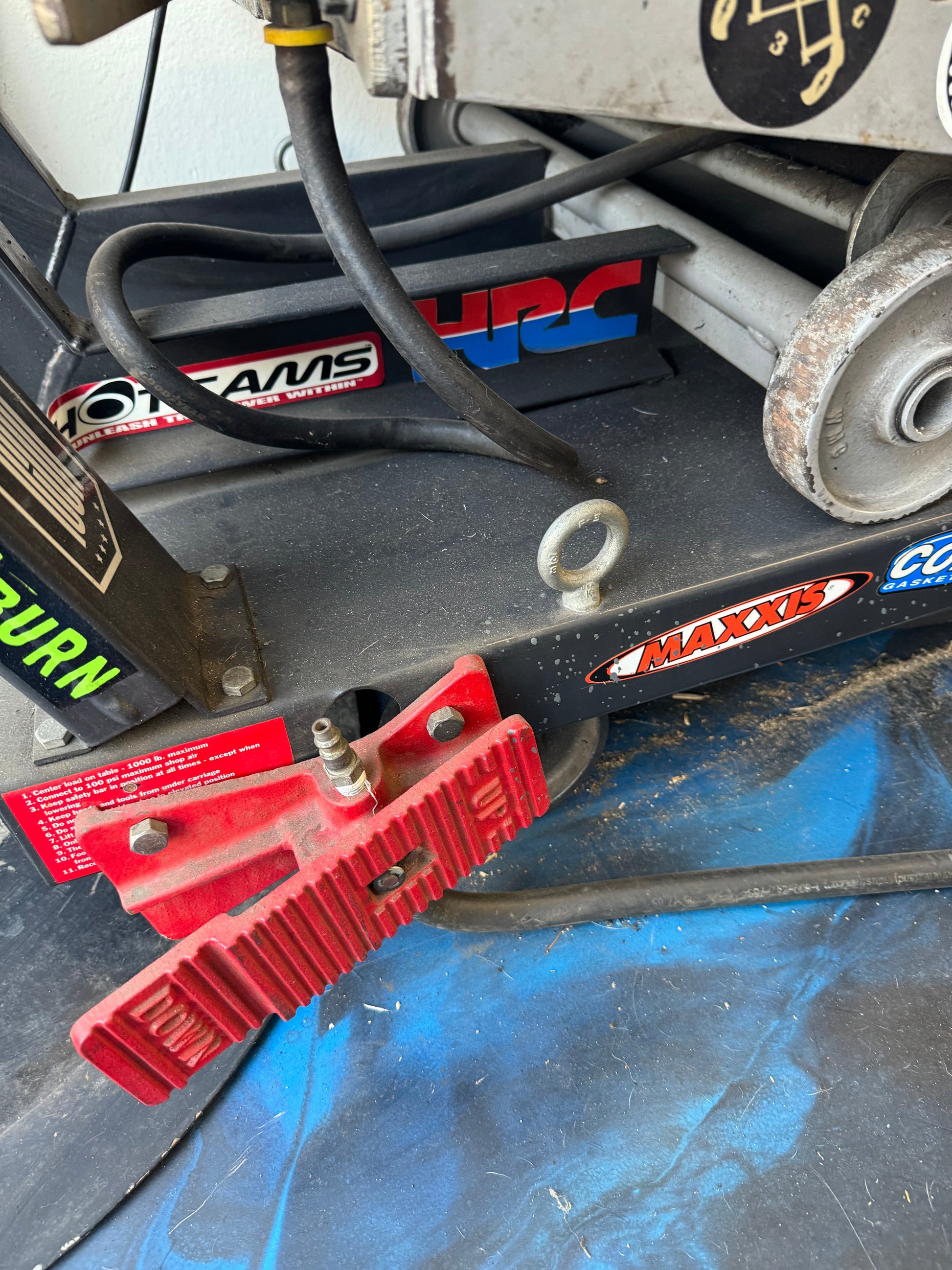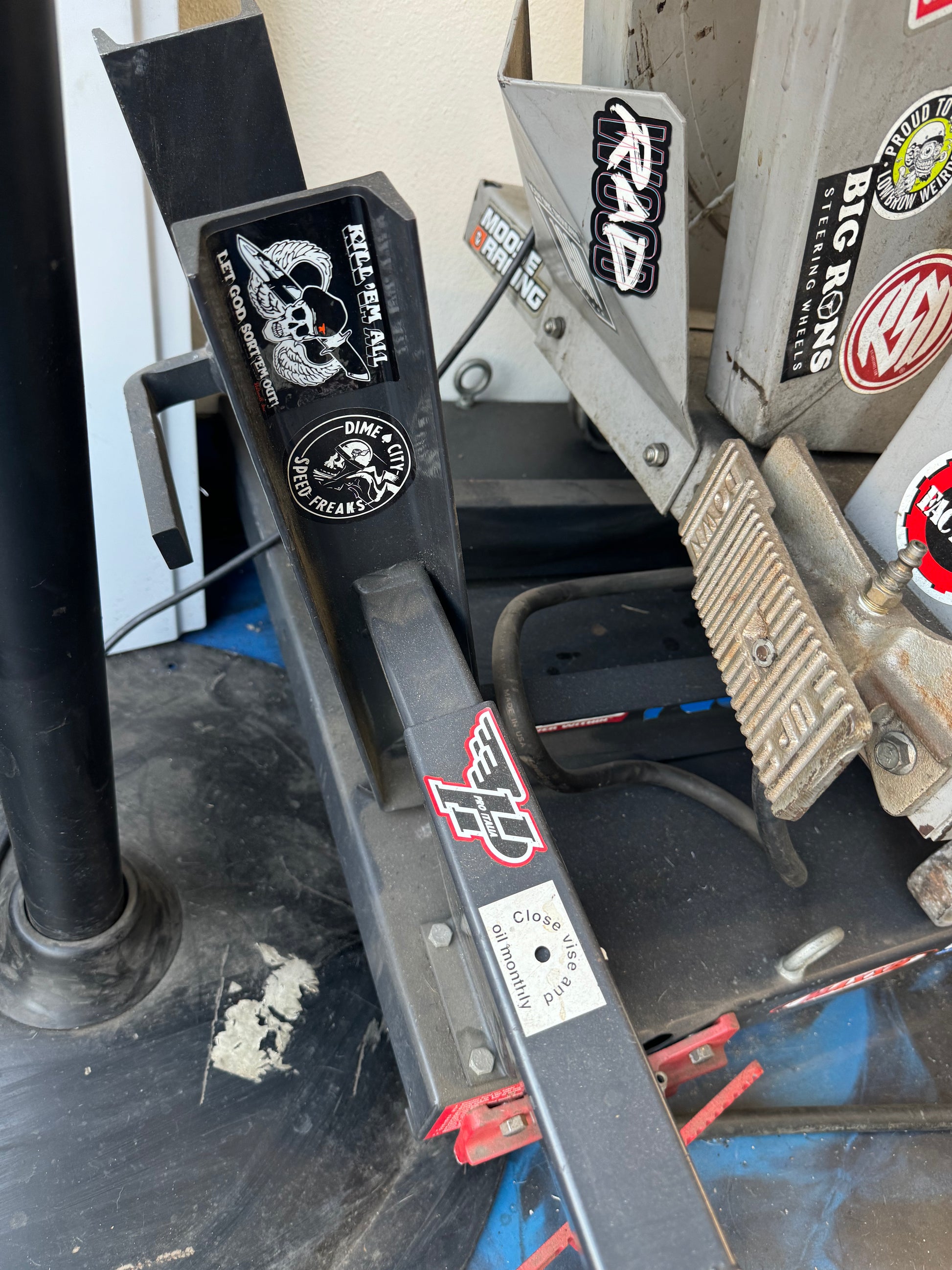 Works perfectly, no problems, just a little dirty. air operated, mounted foot pedal to lift, stickers can come off. Original ramp included, just not in the pics. Also, selling the one under it, take both and I will hook you up with a price.