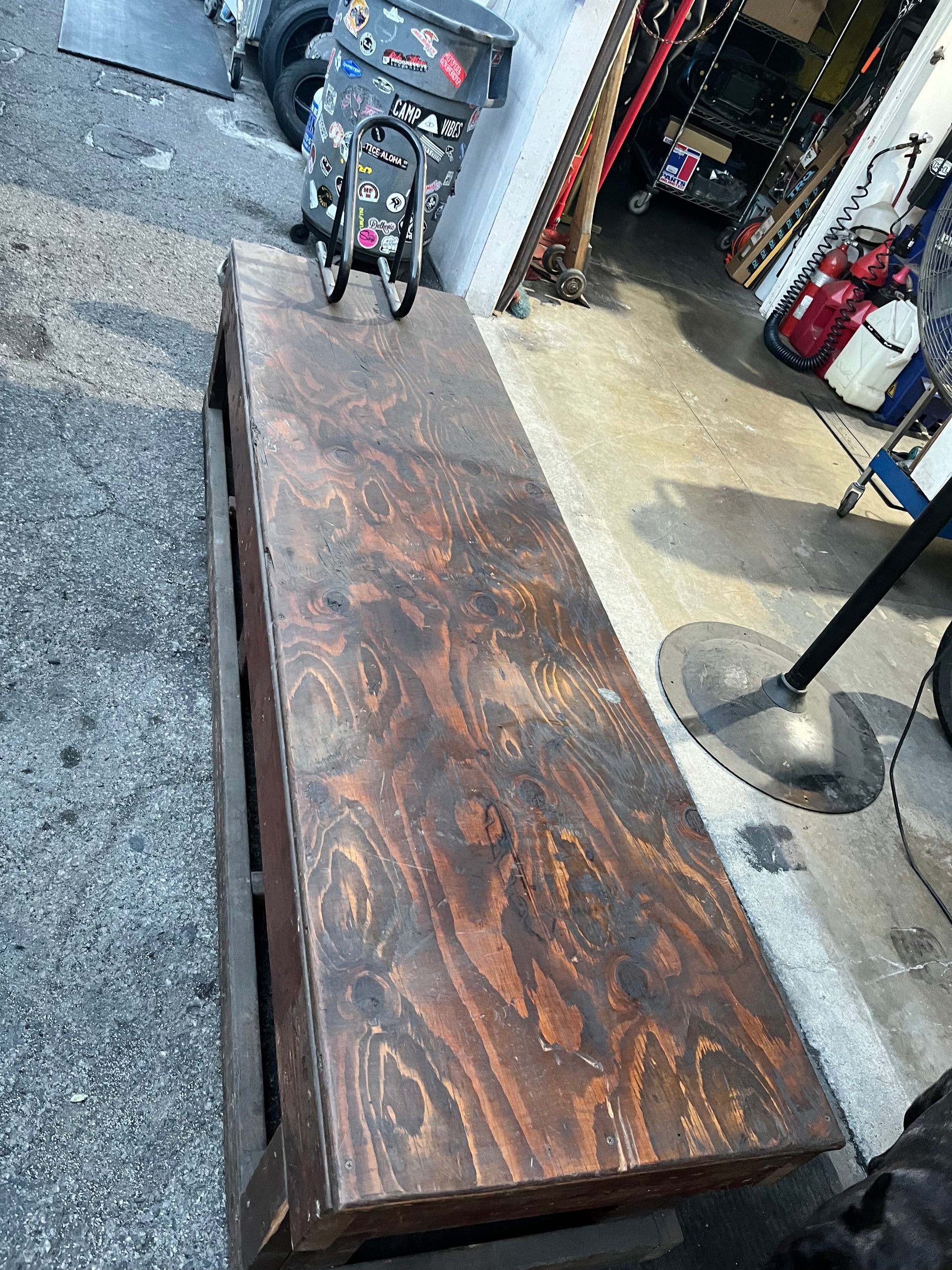 Hand built custom motorcycle stand with wheel chalk, about 7' long, no wheels under it.