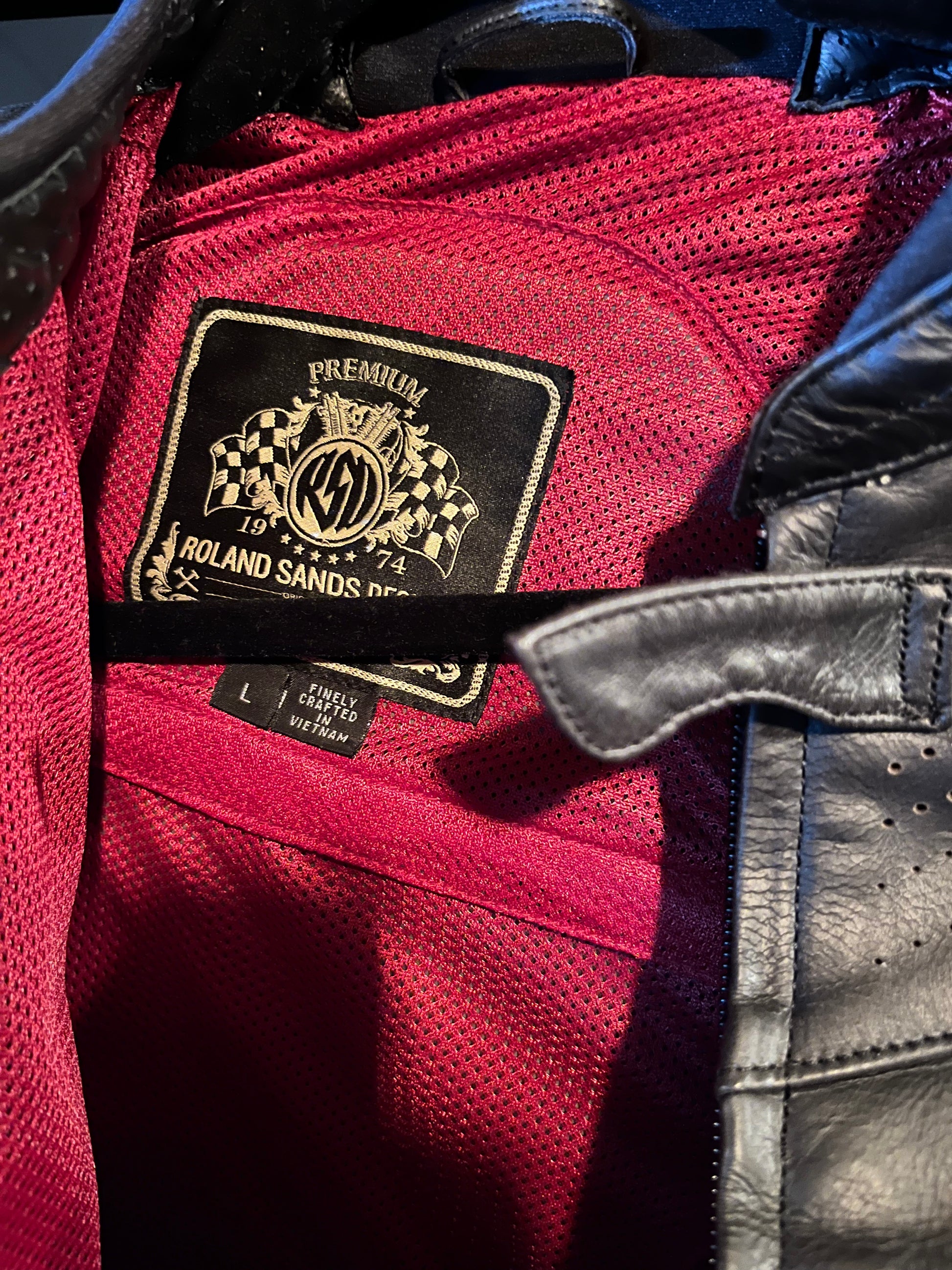 Black leather Roland Sands jacket, Size large, has CE armor, never worn, non smoking, no damage.