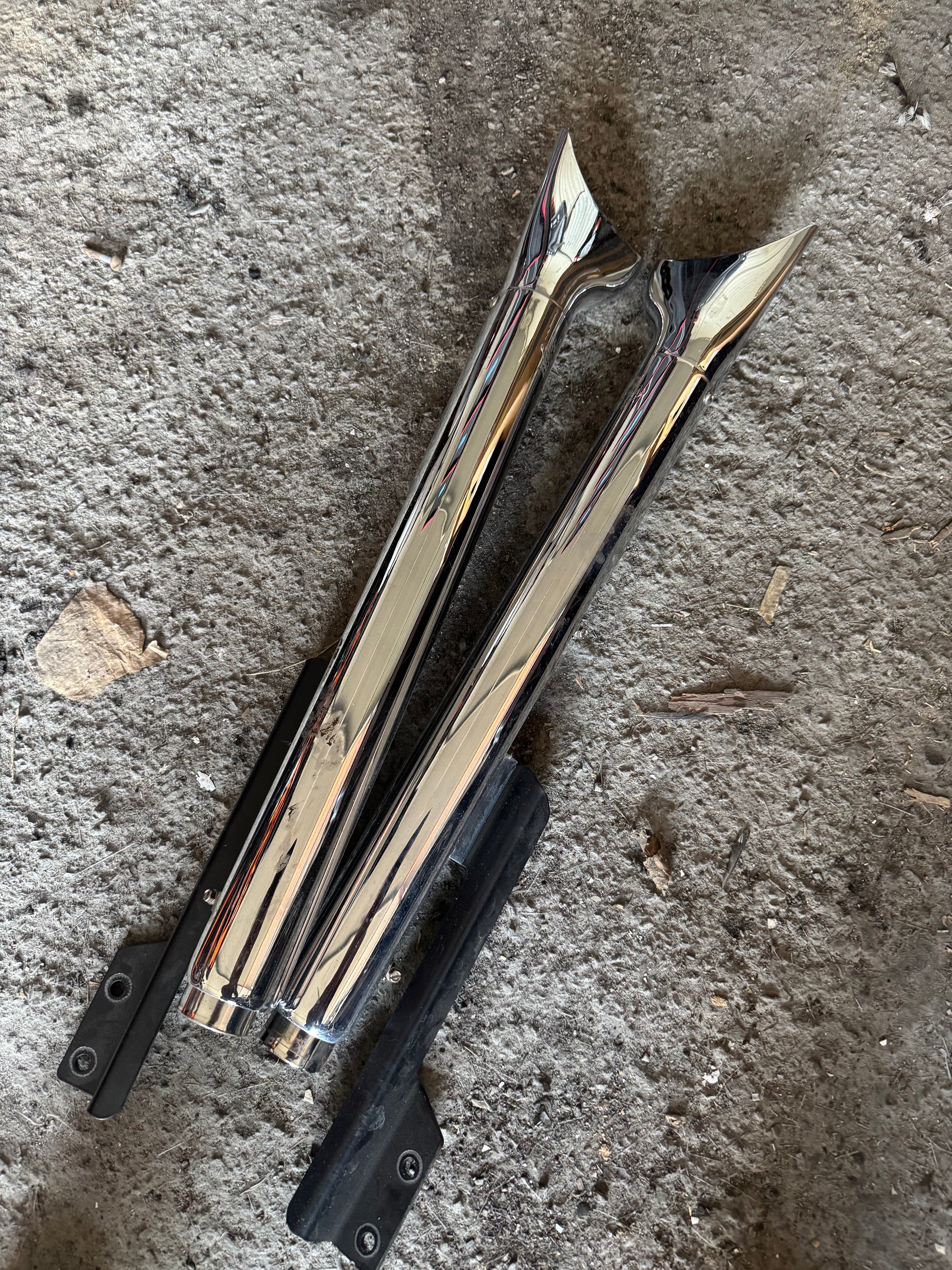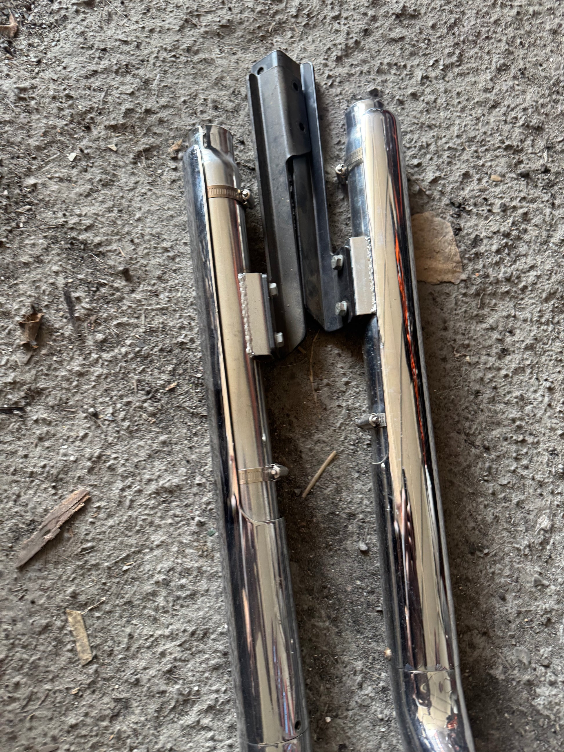 Came off a 2009 Softtail Custom, had the full system, and we just changed the mufflers, these are the Vance & Hines slip-on mufflers with heat shields and brackets, no damage, nice chrome!! Should fit softails and touring models, but you should check before you buy!