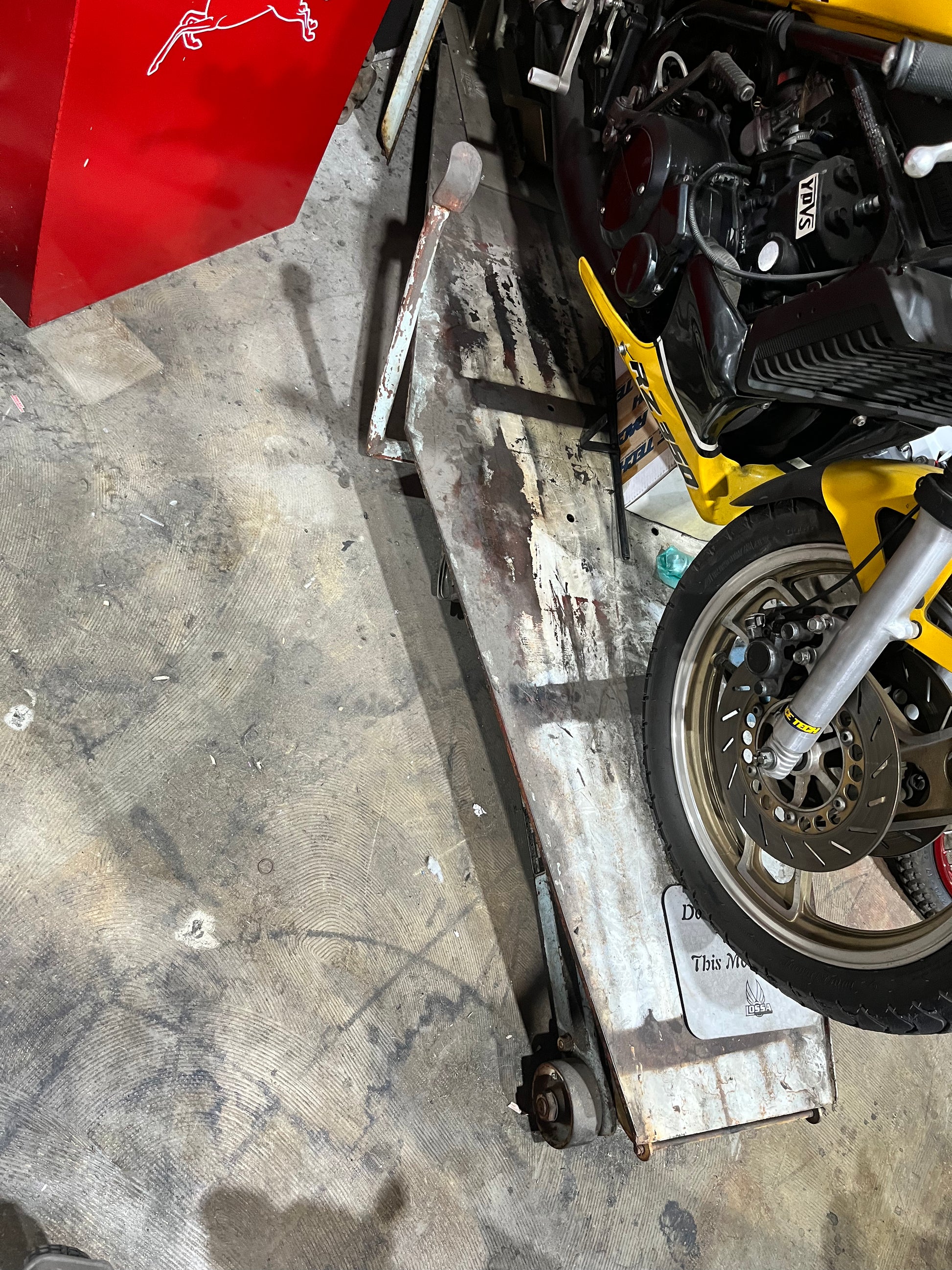 In nice working condition. Was told due to the shape that this was for Vespa's & Lambretta style step through scooters, but will work with any bike. Display your vintage Vespa or Lambretta on it in your house to impress your friends and piss off your wife!!! Includes the original ramp too! I installed a K&S wheel chock(it can easily be un bolted if you do not want it), RZ350 is not included!